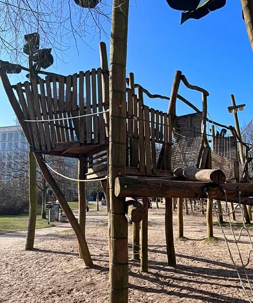 Der Spielplatz im Grasbrookpark bietet ein fantastisches Abenteuer für Kinder! Hier kann Dein Kind auf einem großen Piratenschiff klettern, Wasserläufe erkunden und sich in einer naturnahen Umgebung austoben. Darüber hinaus gibt es entspannende Plätze für die ganze Familie und einen traumhaften Blick auf die Elbphilharmonie.