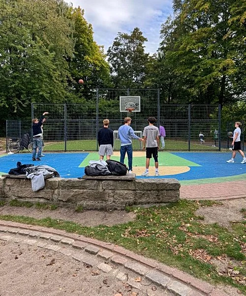 Für ältere Kinder geht es etwas sportlicher weiter. Der Basketballplatz und der Bolzplatz bringen Bewegung ins Spiel und sorgen für kleine Matches zwischendurch.